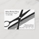 Cartes de visite de salon de coiffure simple mais audacieux conçus avec des ciseaux de coupe et un peigne de style graphique et de carte d'appel générique vous pouvez customiser en ligne dans ce modèle modifiable.