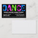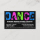 C'est un carte de visite audacieux pour des professeurs de danse. Conception à haute impression avec des couleurs audacieuses et lumineuses ce vraiment POP sur l'arrière - plan noir. Cette carte élégante moderne est sûre de faire une impression durable ! Le graphique grunge urbain frais avec la DANSE en majuscules en vert bleu, pourpre-rose et de chaux, avec des images de style de silhouette des danseurs exécutant la diverse danse se déplace à l'intérieur des lettres. Plusieurs secteurs customisés des textes dans le blanc croquant sur le noir pour votre information de contact de studio, types de cours de danse ou dénomme âges de base de client offert et vos potentiel.