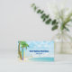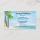 Ce carte de visite de plage dispose d'une planche de surf sur une plage tropicale plantée de palmiers. L'eau est d'un beau bleu et il y a des nuages éparpillés dans le ciel. -