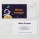 Cartes de visite avec un arrière - plan bleu foncé aux étoiles jaunes éparpillés autour. Couché sur le dessus est l'illustration d'un astronaute vêtu d'une combinaison blanche flottant au-dessus de la lune. Salutations en explorant l'espace. Au loin se trouve une planète avec des anneaux.