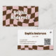 Laissez-vous tenter par cette carte de visite élégante et branchée, dotée d'un motif en damier ondulé rose et marron chocolat. Le design super d'inspiration les années 70, les accents d'étoiles joueuses et la typographie audacieuse font de cette carte une carte idéale pour les créateurs, les influenceurs, les professionnels de la beauté ou toute personne ayant une marque personnelle audacieuse. Inclut un emplacement pour un code QR à lier directement à votre site Web, portefeuille ou socials. Customisez votre nom, votre titre et vos coordonnées pour en faire le vôtre.