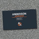 A professional business card in industrial aesthetic for auto repair activities featuring a wrench & gear icon, all on a navy blue background.