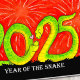 Ce dessin à la main présente deux mignons serpents verts sur un arrière - plan rouge. Les serpents verts tortillent leur corps pour former respectivement les nombres 20 et 25. Le premier serpent et le deuxième serpent se regardent avec amour et entre eux il y a un petit coeur rose. Au-dessus du feu d'artifice rouge de l'arrière - plan peut être vu. Sous les serpents est écrit "Année du serpent" sur un arrière - plan noir.