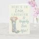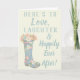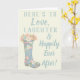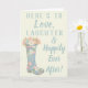 Cette carte de voeux est parfaite pour envoyer votre meilleurs voeux à la future mariée à l'occasion de son wedding shower. Cette carte comporte le message, "voici pour aimer, rire et heureusement pour toujours" sur l'avant dans le lettrage bleu-clair sur un fond en ivoire avec une illustration d'une botte de pluie en caoutchouc modelée florale tenant un bouquet des fleurs. L'intérieur de cette carte de voeux peut être laissé comme est ou être personnalisé avec votre propre salutation faite sur commande.