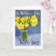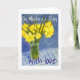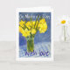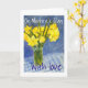 Une carte du jour de mère avec un vase en verre de jonquilles d'or sur un bleu et un blanc a vérifié la nappe, d'une peinture en pastel d'huile originale. Le texte avant lit, "le jour de mère, avec amour" et l'intérieur est laissé vide pour votre propre message.