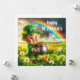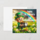 Carte de vœux de la Saint-Patrick avec un adorable lutin tenant un pot d'or dans un champ de trèfles et un arc-en-ciel
