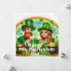 Carte de vœux de la Saint-Patrick avec un homme et une femme lutin buvant de la bière verte, un pot d'or, des trèfles et un arc-en-ciel