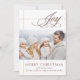Carte de vœux élégante de Noël avec écriture manuscrite Joy. Envoyez de beaux vœux de Noël en famille avec cette carte de Noël élégante dorée et rouge. La carte présente une belle écriture manuscrite Joy en rouge avec des lignes dorées qui se croisent, rappelant un cadeau élégant. Ajoutez facilement votre photo de famille ou votre photo de nouveau-né à la place de la photo standard, pour une touche personnelle.