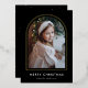 Carte photo de vacances moderne avec votre photo verticale nichée à l'intérieur d'une arche noire avec une bordure en feuille d'or. Personnalisez la carte de vacances en feuille d'or avec votre salutation personnalisée et votre nom de famille en lettres blanches. La carte revient à un simple motif blanc.