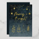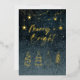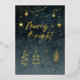 Aquarelle Sky Merry Bright Élégant Script Pine Arbres Noël Carte Foil Personnalisée | Cartes de Noël Joyeuses personnalisées Aquarelle unique | Il présente le texte de calligraphie de script brossé 'Merry + Bright' et des doodles de pins sur le ciel étoilé bleu royal.