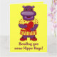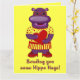 Hippo Hugs (Henrietta Hippo) est un design d'art graphique. Le côté avant de cette carte a un arrière - plan jaune solide. Au centre se trouve Henrietta Hippo. Elle a été créée en violet à deux tons. Elle porte une robe jaune et rouge avec des coeurs et des rayures. Elle a des lunettes de coeur rouges et des talons hauts rouges. Dans ses mains est un grand coeur rouge. Le texte décoratif sur le bas dit : Vous envoyez des huppons hippo ! L'intérieur de la carte est également jaune. Modifiez le texte pour personnaliser votre carte avec vos propres mots. Le coeur et le texte embellissent l'intérieur et l'arrière de la carte. Obtenez ce même art hippo dans des designs et des couleurs assortis sur de nombreux produits zazzle. Cette carte est une carte Jumbo, vous pouvez obtenir n'importe quelle taille. *La petite fleur de soie sur les chaussures a été créée en utilisant des outils psp d'achat et des scripts de Joannes Digital Designs. Licence #32.