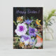 Trouvez cette jolie carte de vacances orientale avec des roses et des fleurs bleu violet sur un fond noir avec des nuances de rose et de vert.