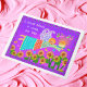 Contre un arrière - plan violet, ce charmant ange d'art populaire avec un gâteau d'anniversaire survole des tournesols jaunes pour offrir des voeux d'anniversaire spéciaux. Des oiseaux et des papillons d'art populaire colorés l'accompagnent en chemin. Des bougies lumineuses sur le gâteau d'anniversaire produisent une belle lueur. Idéal pour les petits et les grands, les amateurs d'anges et de tournesols et les amateurs d'art populaire. Gai, charmant, mignon et doux ! Disponible plié ou plat.