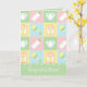 Quatre carrés aux pastels doux de rose, vert, bleu et jaune sont encadrés par un design blanc comme des points de couture et décorés d'icônes mignonnes sur le thème du bébé d'une bouteille, d'une couche, d'un hochet et d'un bib. Une sucette bleu, rose et jaune vif ajoute une touche finale amusante à l'arrière. Customisez le sentiment sur le panneau de superposition à l'avant et à l'intérieur avec votre message de choix pour créer une carte vraiment unique pour n'importe quel baby shower ou future mère. Vous pouvez également changer la taille de la carte de note pour en faire une carte de remerciements douce après la douche. N'oubliez pas de consulter la collection complète de courtepointes pour bébés pour obtenir d'autres cadeaux et des produits pour un baby shower ou le petit de votre vie.