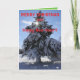 Une photo d'un sapin de Noël enneigé pendant la période de Noël. C'est clair et coloré. Sur une carte de voeux. Avec le soleil brillant a jeté l'arbre en forme d'étoile. Par une froide journée d'hiver.