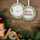 Belle étiquette-cadeau de Noël fleurie avec une couronne de vert sauge, fleurs blanches et baies rouges où vous pouvez écrire à qui et de qui le cadeau de Noël est.