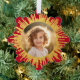 Carte d'ornement de Noël rouge, en forme de flocon de neige, avec votre photo personnalisée à l'intérieur d'une bordure d'éclatement de soleil rétrograde et doré (image imprimée, pas de véritable feuille). Texte personnalisable à l'arrière.