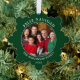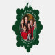 Carte d'ornement moderne Feliz Navidad Photo de Noël - Arrière - plan vert de la forêt. C'est une carte de voeux qui est aussi un ornement.