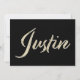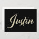 Une carte personnalisée belle et noble / carte de vœux / carte cadeau / carte d'anniversaire avec design d'écriture main en or blanc liquide pour Justin.