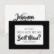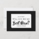 Chaque marié a besoin de son meilleur ami à ses côtés le jour de son mariage. Demandez-lui d'être votre témoin avec cette carte de proposition amusante. Caractéristiques texte noir en écriture grasse avec un motif de carré blanc géométrique sur fond noir. Le dos comporte un espace pour écrire un message spécial.