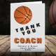 Carte d'entraîneur moderne de Merci de basket-ball. La carte a un ballon de basket à l'avant et à l'arrière. Grande carte pour remercier les entraîneurs sportifs, les formateurs d'équipe du lycée, les entraîneurs de maman ou papa, etc. Customisez tout texte sur la carte. Ajoutez le nom de l'entraîneur, le nom de l'équipe et l'année.