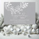 Simple et moderne, cette carte de vacances d'entreprise dispose d'une branche blanche avec des feuilles et à feuillage persistant sur un arrière - plan gris avec un texte blanc qui lit Happy Holidays avec une zone que vous pouvez facilement ajouter vos informations. Le dos de la carte a des branches blanches, des feuilles, des flocons de neige et des poires sur un fond gris.