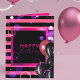 Un design tendance et personnalisé de carte d'anniversaire avec des ballons noirs, roses et violets sur un arrière - plan rayé horizontal rose et noir brillant. Le texte est entièrement personnalisable.