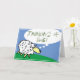 Carte de mouton amusante. Design a un mouton de dessin animé avec le jeu de mots "Thinking of Ewe!". Illustration de dessin d'un mouton dans un champ vert contre un ciel bleu.