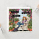 Une bande dessinée amusante illustration d'une femme assise sur sa chaise de jardin sur son patio, avec son chat, une tasse de café ou de thé et entourée de clématites violettes et de plantes pendants.