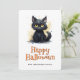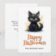Bonne carte Halloween avec une aquarelle illustrant un chat noir. Personnalisez facilement cette jolie carte d'Halloween pour les enfants avec votre nom de famille et texte.