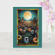 Cette carte d'Halloween présente une scène éffrayante et festive sous une pleine lune éclatante. Au premier plan, un rassemblement de citrouilles sculptés, chacun avec un visage unique et sinistre, semble prendre vie. Les citrouilles ont des expressions animées, allant des grins espiègles aux regards sinistres, ajoutant une atmosphère ludique mais éffrayante. L'arrière - plan présente un paysage hantant avec des silhouettes foncées d'arbres et de vieilles maisons mystérieuses aux fenêtres éclatantes, ajoutant à l'ambiance sinistre de la nuit.