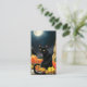 Un chat noir est assis à la porte avec des citrouilles, une lanterne, un balai, des feuilles d'automne et une pleine lune de récolte derrière