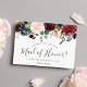 La carte de proposition de fête de la mariée à fleurs chic comporte une bordure supérieure de marsala bordeaux, des fleurs rose vif et bleu marine, avec un feuillage botanique luxuriant et de la verdure. Personnalisez avec votre bonne d'honneur les détails de la demande (montré avec "serez-vous ma bonne d'honneur? Je ne peux pas dire que je ne fais pas sans vous") en écriture manuscrite moderne et en écriture sans serif traditionnelle. Les invitations se retournent vers le riche bijou tonique bleu marine.