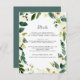 Conçue pour coordonner avec notre collection de mariages Alabaster, cette carte d'information végétale et fleurie fraîche présente une bordure de verdure, de feuillage et de fleurs blanches encerclant vos principaux détails mariages, tels que les chambres d'hôtel, les informations de bienvenue à la réception, le site Web et plus encore. Ajoutez votre texte personnalisé à l'aide des champs fournis et utilisez la fonction Personnaliser pour ajuster les polices, les tailles et l'espacement.