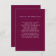 Cette carte d'insertion intemporelle d'informations clients présente une teinte bordeaux/violet profonde. Vous pouvez utiliser ces cartes pour inclure des informations sur votre réception de mariage, les itinéraires, l'hébergement et tout ce que vous devez savoir à vos invités! Ce design fait partie de la suite Mariage Botanique Boho de Bourgogne de Designs de Papier Imprimé.