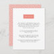 Élégantes et chic, ces inserts de faire-part de mariage ultra-modernes comportent des "Details" posés sur un élément rectangulaire dans une pêche corallienne ensoleillée et vibrante. Remplacez l'exemple de texte par les détails clés de la célébration de votre mariage, puis ajustez la couleur à votre préférence en utilisant les instructions simples ci-dessous. Les cartes renversent à un motif de clé grecque moderne en option dans le corail et blanc assortis. Vous vous demandez quelles informations inclure sur un encart faire-part de mariage ? Prenez en compte des détails comme l'hébergement à l'hôtel, les codes de groupe, l'itinéraire, le transport, les informations sur la réception de bienvenue et l'URL de votre site Web mariage. POUR MODIFIER LA COULEUR : - Cliquez sur "Customiser" - Sélectionnez une nouvelle couleur dans la palette, ou cliquez sur l'icône du curseur, puis sur "Avancé" pour accéder au spectre de couleurs complet et à un champ de code hexadécimal pour une personnalisation finale. - N'oubliez pas de changer la couleur du dos de la carte.