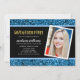 La carte d'invitation de fête de fin d'études avec paillettes bleues et photo comporte les mots «Fête de fin d'études» dans une police sans empattement amusante en feuille d'or fausse avec un haut et un bas en paillettes bleues fausses et un fond noir au centre. L'invitation a un motif de bandes bleues, noires et en feuille d'or fausse au verso.