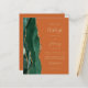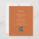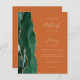 Économisez le coût d'impression et d'envoi de cartes RSVP séparées avec cette élégante invitation de mariage moderne et économique tout-en-un. Le bord gauche présente une bordure d'agate à l'aquarelle vert émeraude rehaussée de paillettes dorées fausses. Le texte personnalisable combine une écriture dorée, des polices copperplate et italiques sur un fond orange brûlé ou rouille. Le verso offre un espace pour les détails du mariage, ainsi qu'un code QR que les invités peuvent scanner pour visiter votre site web et répondre.