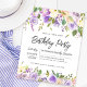 Honorez une femme spéciale avec cette invitation élégante et féminine pour une fête d'anniversaire. Les détails de la célébration d'anniversaire sont entourés de bordures florales violettes en haut et en bas. Les éléments floraux sont nichés dans des feuilles vert foncé. Bien qu'il s'agisse d'un design traditionnel, le feuillage botanique et le texte ouverts et aérés lui donnent une ambiance contemporaine. Cet article fait partie de la collection Botanique Florale Violette Rustique.