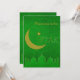 Carte d'invitation pour une soirée Iftar élégante avec la silhouette d'une mosquée, lune et étoile en vert et or.