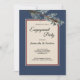 Cette carte d'invitation pour la fête de fiançailles Pine Blue Winter combine une bordure encadrée bleue poussiéreuse, élégante et formelle, avec des branches de pins élégantes et persistantes pour un look classique mais rustique. Le feuillage botanique vert avec une typographie calligraphique sur un fond beige crée une ambiance axée sur la nature pour une célébration de mariage de Noël ou de destination forestière.