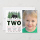 Cartes d'invitation pour l'anniversaire des 2 ans d'un garçon avec des sapins verts et un ours avec photo. Cette carte d'invitation pour les 2 ans avec un ours mignon de la forêt est facilement personnalisable pour votre événement en ajoutant simplement vos informations et votre photo.