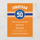 Des rayures bleues royales et un fond orange mettent en valeur cette carte d'invitation pour une fête d'anniversaire sur le thème du sport. Le design comprend un motif de maillot de sport avec un espace pour mettre en évidence le nom et l'âge du garçon qui fête son anniversaire.