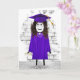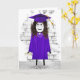 Baguette fille avec cheveux longs et foncés, diplôme de fin d'études, robe violette, basket, et casquette pour les félicitations diplômées.