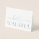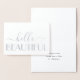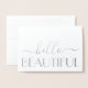Envoyez des notes élégantes pour toutes les occasions avec de belles cartes de notes pliées en feuille d'argent Hello Beautiful. Tout le libellé de ce modèle est simple à personnaliser ou à supprimer, et les styles de police peuvent être modifiés avec l'outil de conception Zazzle. Le design minimaliste moderne chic présente une véritable feuille d'argent métallique sur le devant, un script de calligraphie élégant et une typographie de style art déco vintage. Ces cartes personnalisées élégantes peuvent être personnalisées en tant que notes de remerciement, cartes "je pense à vous" ou pour tout autre usage de votre choix.