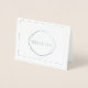 Real Silver Foil Thank You Note Card est montré en blanc avec un nom d'échantillon et de bordure et d'impression d'accent dans un vrai papier argenté. Customisez cette carte et changez l'exemple de texte à vôtre avec ce modèle ou achetez comme indiqué.