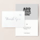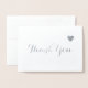 Un joli design "amour et merci"... devant la carte : les mots "Merci" dans une police de caractères en feuille d'argent; à l'intérieur : votre photo spéciale; à l'intérieur : mots personnalisés et vos noms; à l'arrière; un petit coeur en feuille d'or