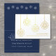 Envoyez simplement des souhaits de vacances élégants à vos clients, clients et associés d'affaires avec d'élégants cartes de fin de année en papier peint. Tout le libellé de ce modèle de carte pliée est simple à personnaliser. Les ornements de Noël et le texte à l'avant sont imprimés avec de la vraie feuille d'or métallique sur un arrière - plan blanc de base. Le design minimaliste moderne bleu marine et blanc présente des ornements élégants de flocs de neige et une typographie classique simple. Veuillez noter que l'intérieur est imprimé en couleur et non en papier métallique. Disponibles en petites quantités et en vrac, ces cartes conviennent aux petites entreprises et aux professionnels d'entreprise. Les clients d'affaires, les familles et les amis aimeront le luxe sophistiqué de ces cartes de voeux de vacances personnalisées. JOYEUSES FÊTES !