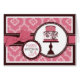 Le gâteau élégant avec l'arc de ruban du regard 3D et les étiquettes au-dessus d'une damassé rose impriment.