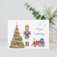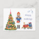 Carte de Noël pour Enfants. Casse-noix avec tambour à côté d'un arbre de Noël coloré et train de jouets.
